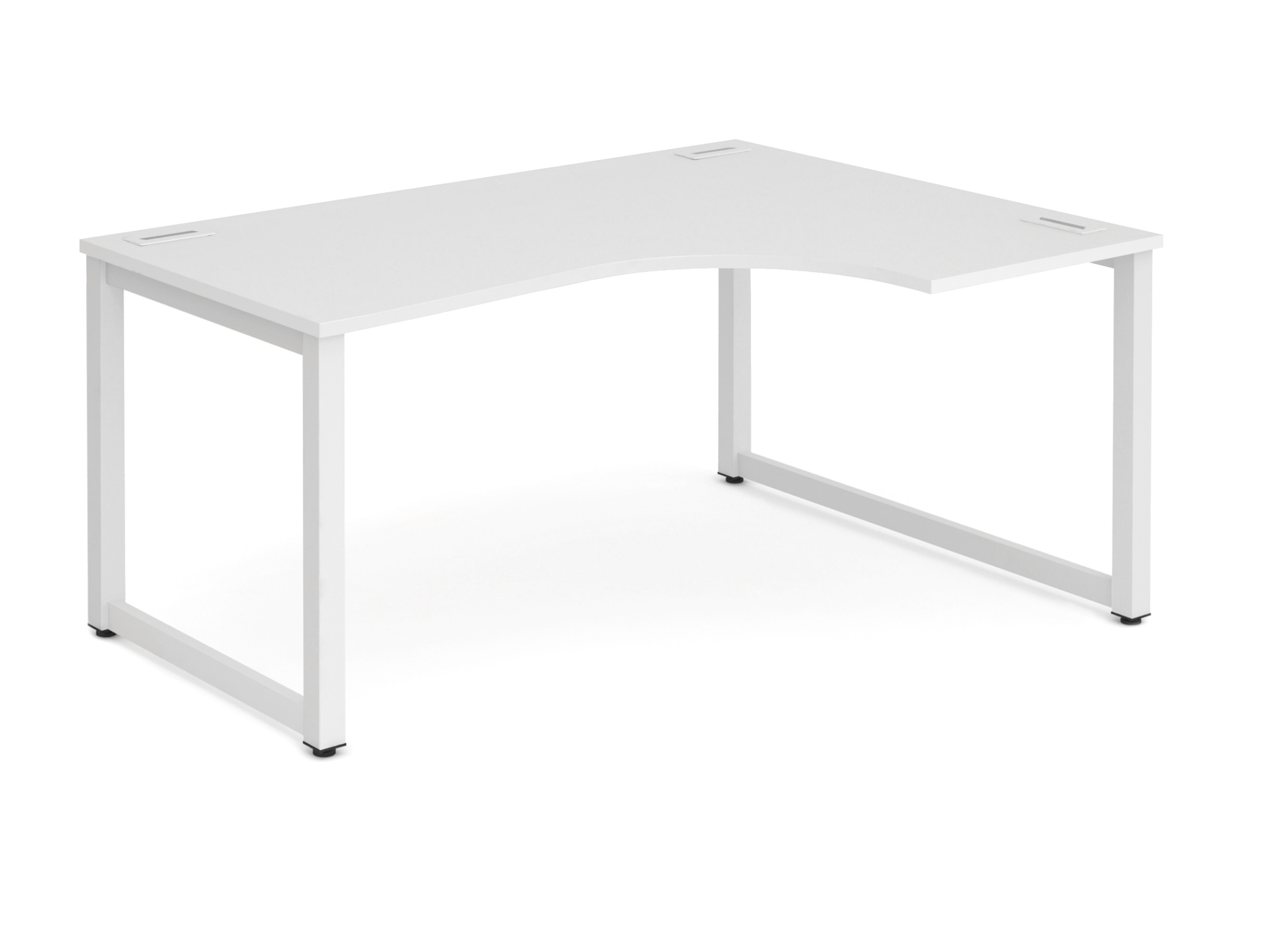 Eckschreibtisch mit geschwungener Arbeitsplatte und massivem Tischuntergestell