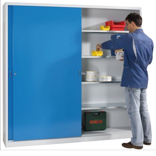 Ideal auch als Reihenanlage geeignet. Leicht gängige, rollengelagerte Schiebetüren mit hochwertigem Zylinder- Sicherheitsschloss und verzinkten Fachböden