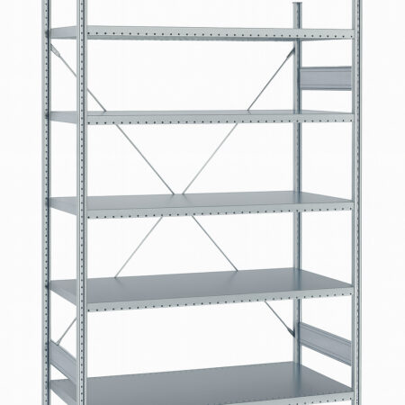 Das R3000 Regal ist mit einer Bauhöhe von 2.278 mm und einer Tiefe von 500 mm perfekt zur strukturierten Lagerung von großen Lasten geeignet. Dabei kann gewählt werden zwischen einer Feldbreite von 994 mm oder von 1282 mm. Die Kreuzverbände dienen zur Stabilisierung des Lagersystems von SSI Schäfer.