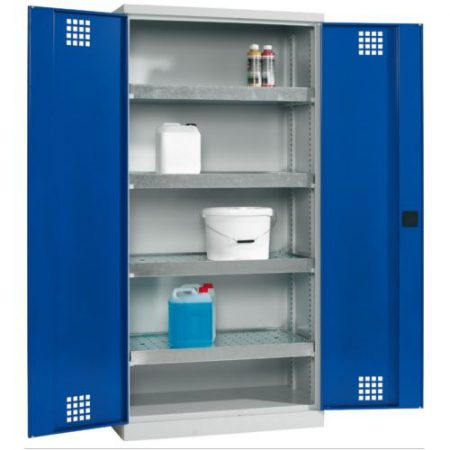 - Verzinkte dichtgeschweißte Wannenböden, verstellbar, mit gelochtem Innenboden, damit die Gebinde nicht in ausgelaufener Flüssigkeit stehen