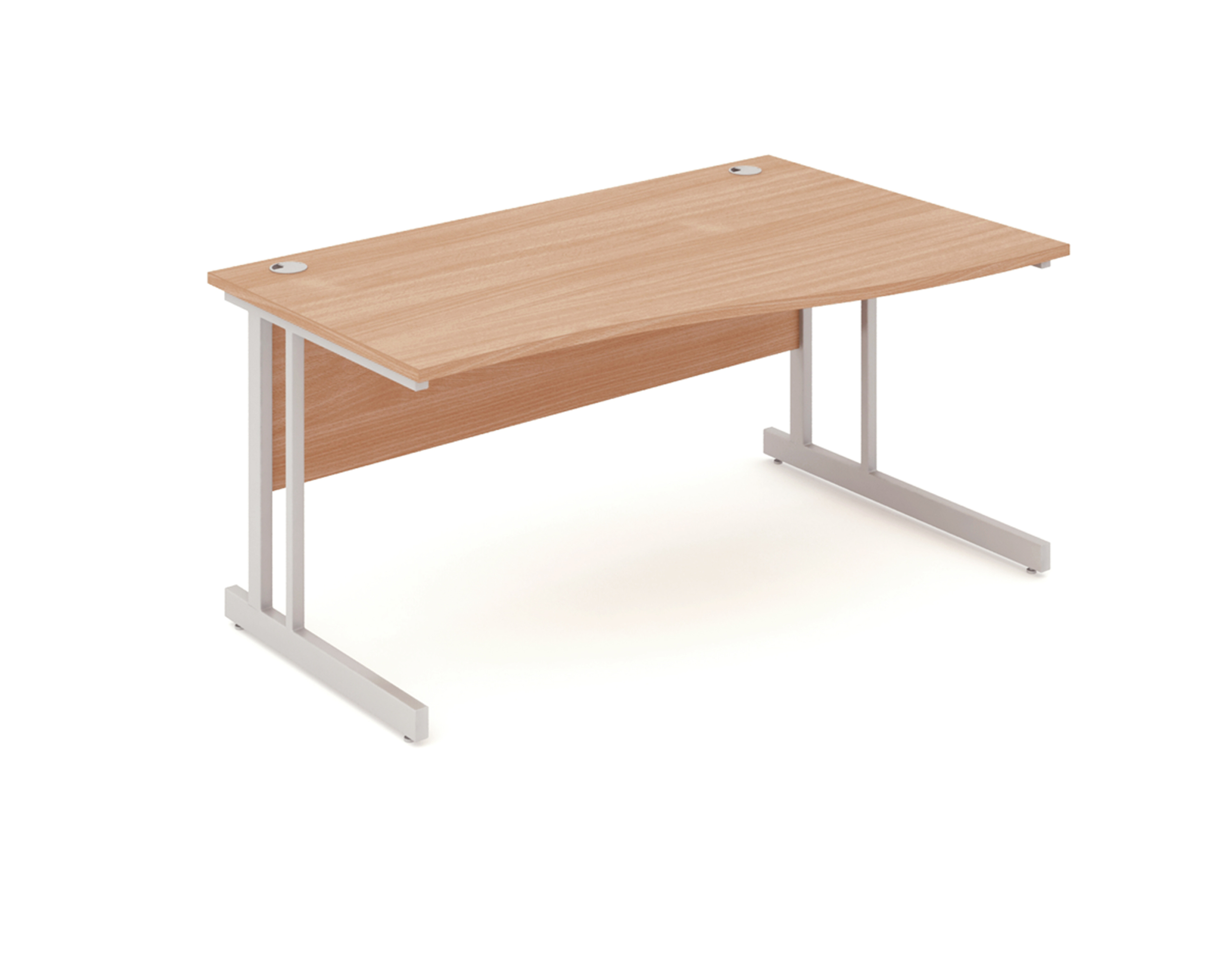 Schreibtisch mit Metalluntergestell und geschwungener Tischplatte.